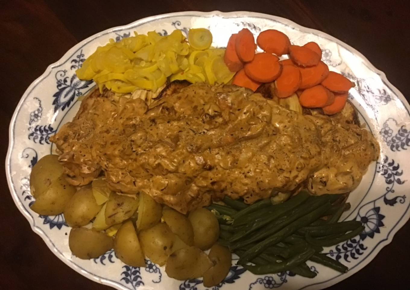 - Add cup of coconut cream, bring to boil, thicken, pour over eggplant on plates, serve. Sprinkle crushed fresh peppercorn on top. Garnish with boiled new fingerling potatoes, steamed sliced yellow squash, steamed green beans and steamed carrot slices. Enjoy.