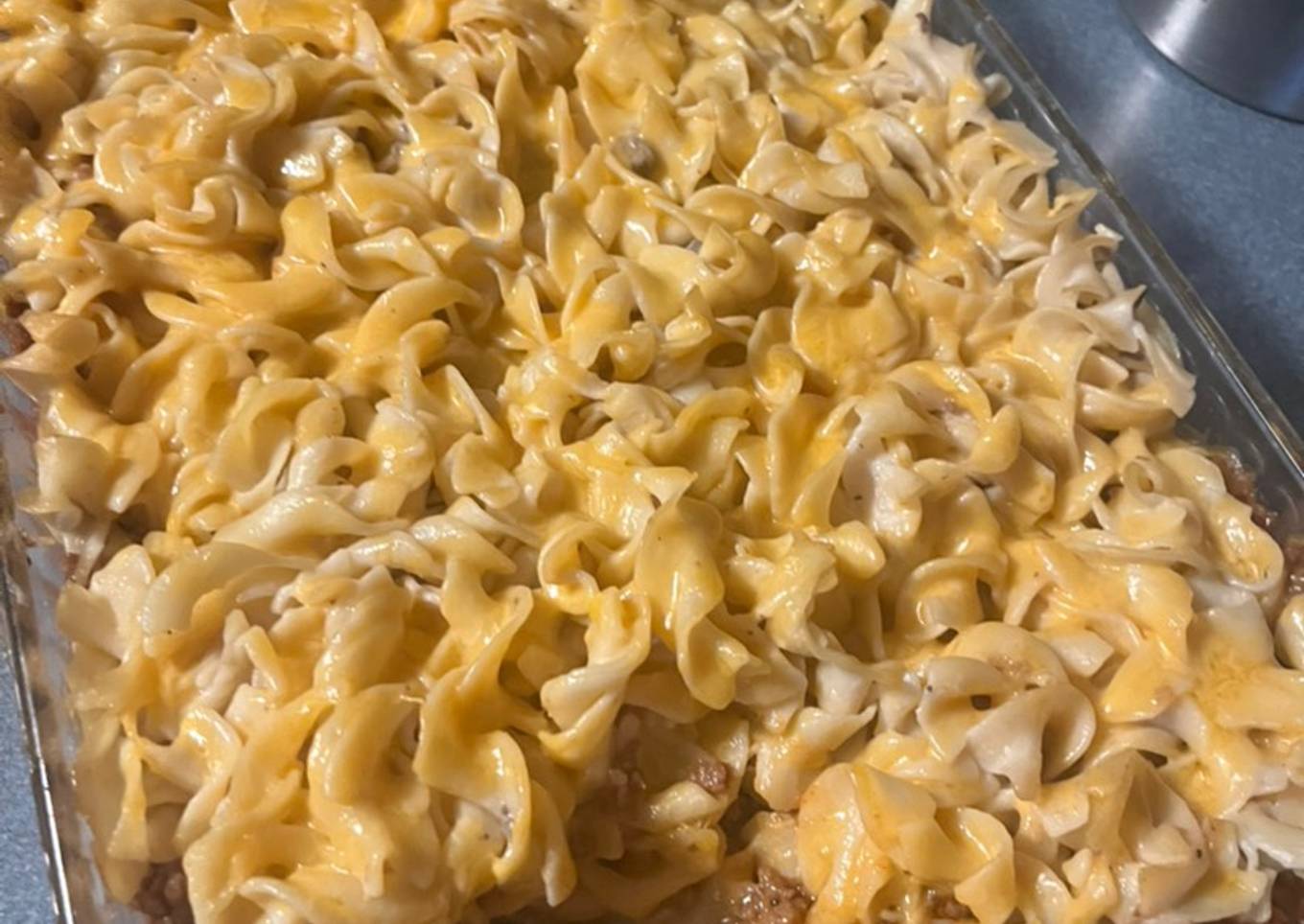 - Spray 9 x 13 baking dish. Add 1/2 of noodles mixture to pan and layer 1/2 of cheese to top. Then spread meat mixture on top of that.