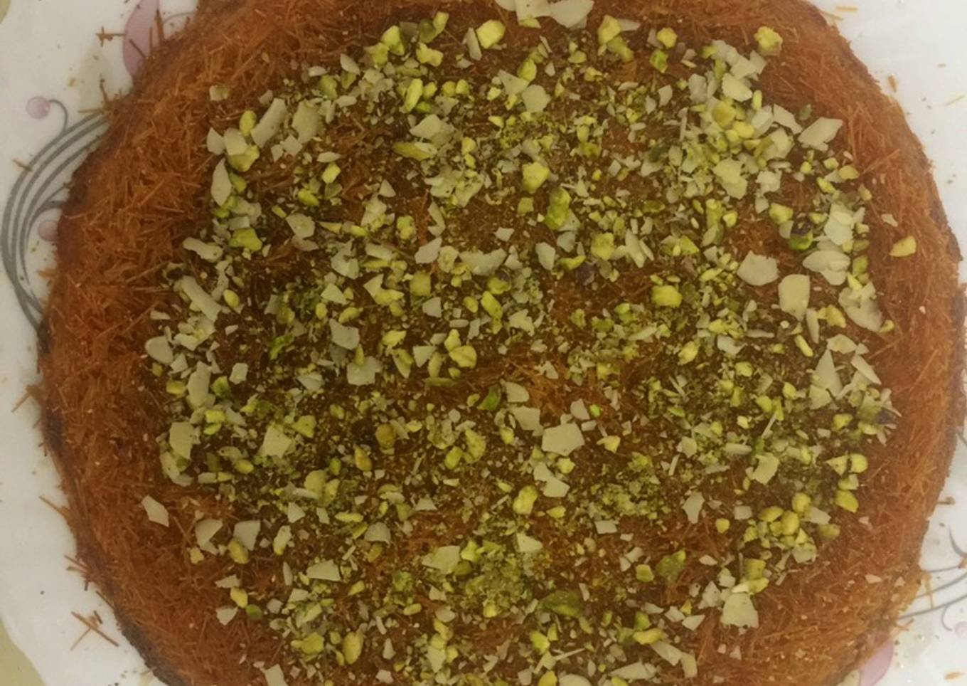 - Let it cool and transfer to a plate and pour the sugar syrup and garnish with pistachios.Kunafah is ready to serve 😋