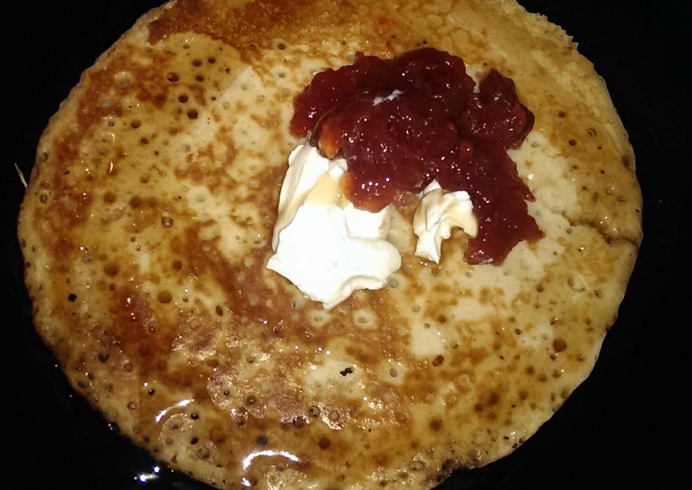 - when pancake is ready set onto a plate and top with cream cheese and strawberry jam in the middle and drizzle buttermilk syrup all over. This is sooo kid friendly and yummy they'll love this on sleep over night events. enjoy.