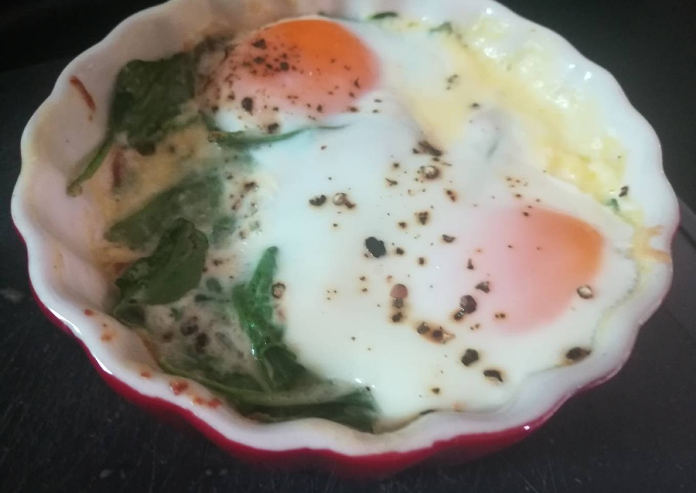 - Grind some salt/pepper into your eggs then top with cream. Make sure any uncovered spinach at the top of the dish gets cream on it. Any spinach not covered by cream or egg will burn.