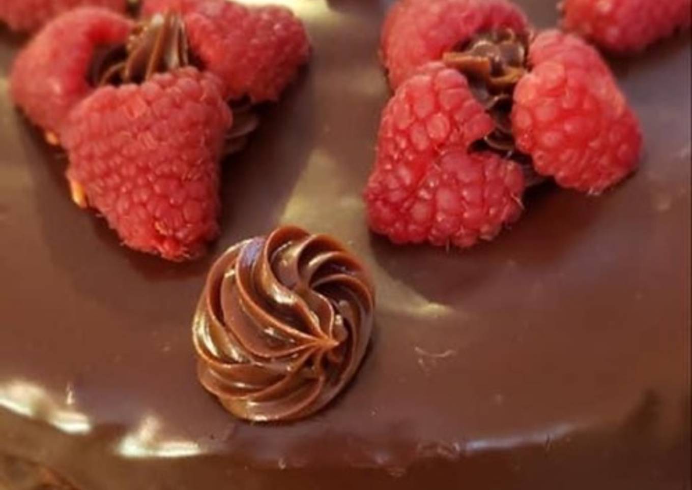 - Remove cake and ganache from refrigerator. Put chilled ganache in a icing pastry bag (any tip preference), remove cake from spring foam pan and coat entire cake sides and top in room temperature ganache. Then decorate top of cake with chilled ganache and place halved raspberries on top for decoration (optional), or shave some white chocolate swirls on top. Can also coat with crushed cookies, nuts, sprinkles, anything that sounds good to you 😃 )