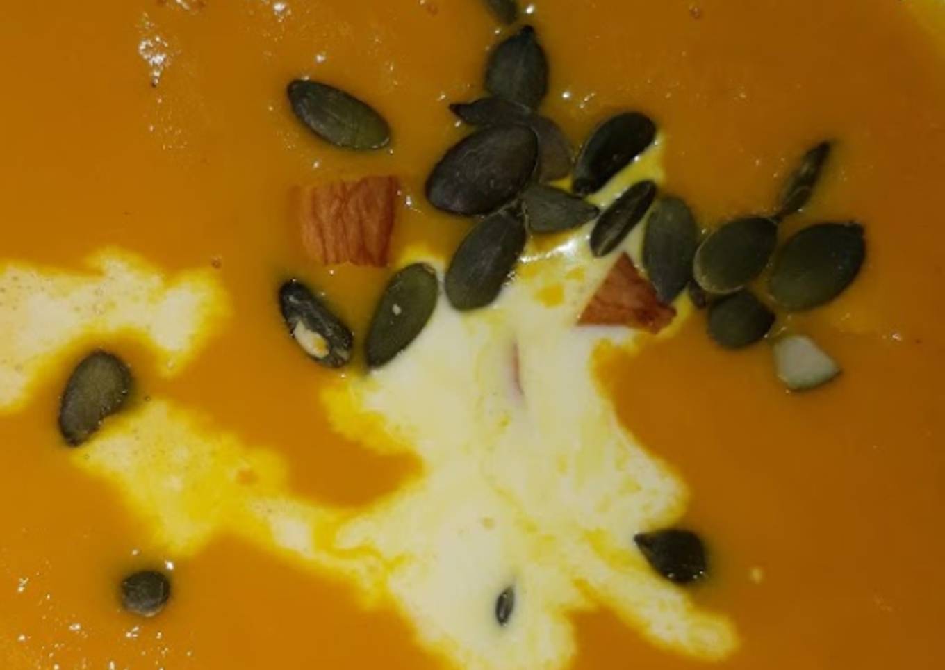 - Put in serving bowls, and add a thin swirl of heavy cream on top. You can garnish with black pumpkin seeds and sliced almonds.