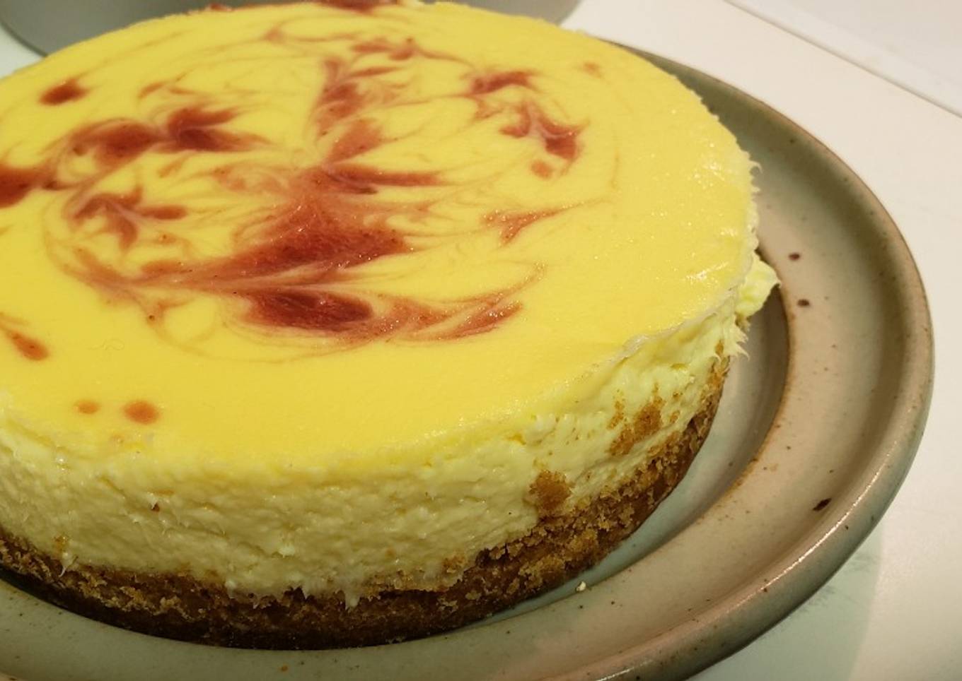 Puree the fruit of your choice and sugar together in a blender. Pass the mixture through a mesh strainer if seeds are in it (strawberries). Before Cheesecake Step 2, dot your puree on top of the cheesecake, then take a toothpick and swirl the top. Be careful to stay on the surface, we don't want the puree to get pushed under the cheesecake filling. Proceed with Step 2 as normal. - Cookie Dough Chunk