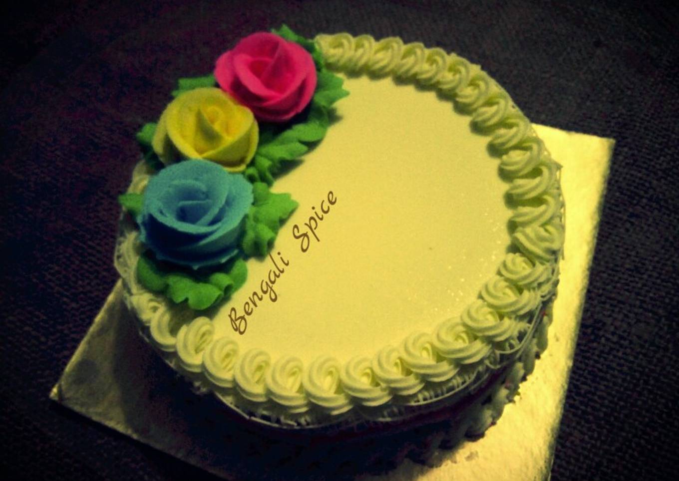 - Top with the third cake layer. Spread the remaining frosting all over the top and sides and decorate it whatever looks you want by mixing food colors into some frosting. Use the decorating nosels to give the flower and leaf shapes on the cake. You can decorate it with your favorite food color and your favorite style.