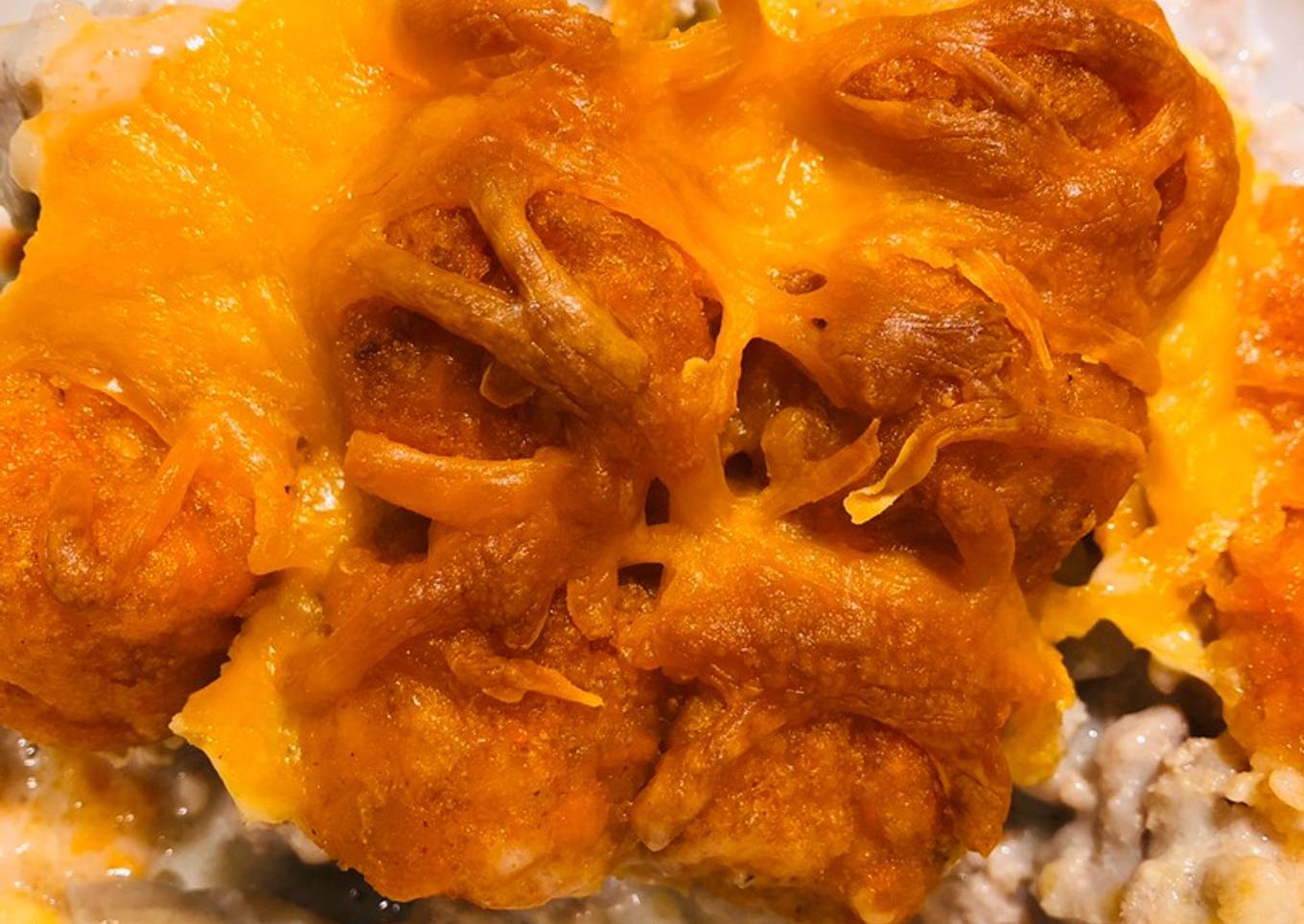- Pour turkey mixture into a greased baking dish, top with frozen tater tots and shredded cheddar cheese.....