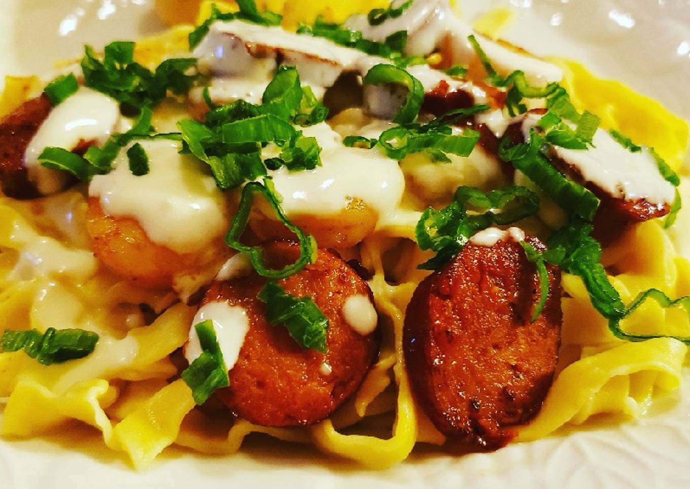 - Mix noodles with sauce. Top with shrimp and sausage and diced scallions.
