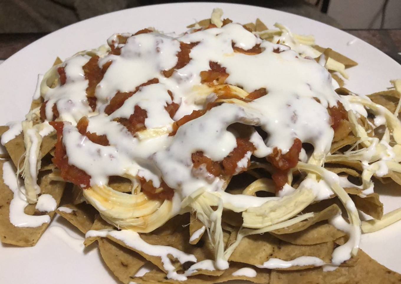 - To plate: heap some tortilla chips on a plate, cover with the cheese and drench in the sauce (which should be as hot as possible so it melts the cheese). Let it rest for a bit for the cheese to melt and the tortillas to absorb some of the sauce. Then, add the sour cream. Your Mexican/Chinese fusion Chinaquiles are ready!