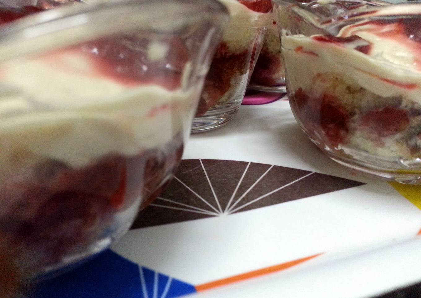 - In small serving bowls (approximetly 10) put a layer of cake, then strawberry mixture, then cake, then cream cheese, and finally strawberry mixture.