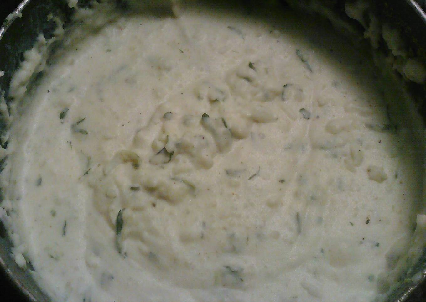 - When fork tender, drain potatoes but reserve some broth. To your pan, add your potatoes, parsley, salt, pepper, bit of cayenne, couple tablespoons of broth, splash of milk and a block of cream cheese. Please, don't let your cat lick the cream cheese. Or do..just don't tell anyone who will partake in your perterders.