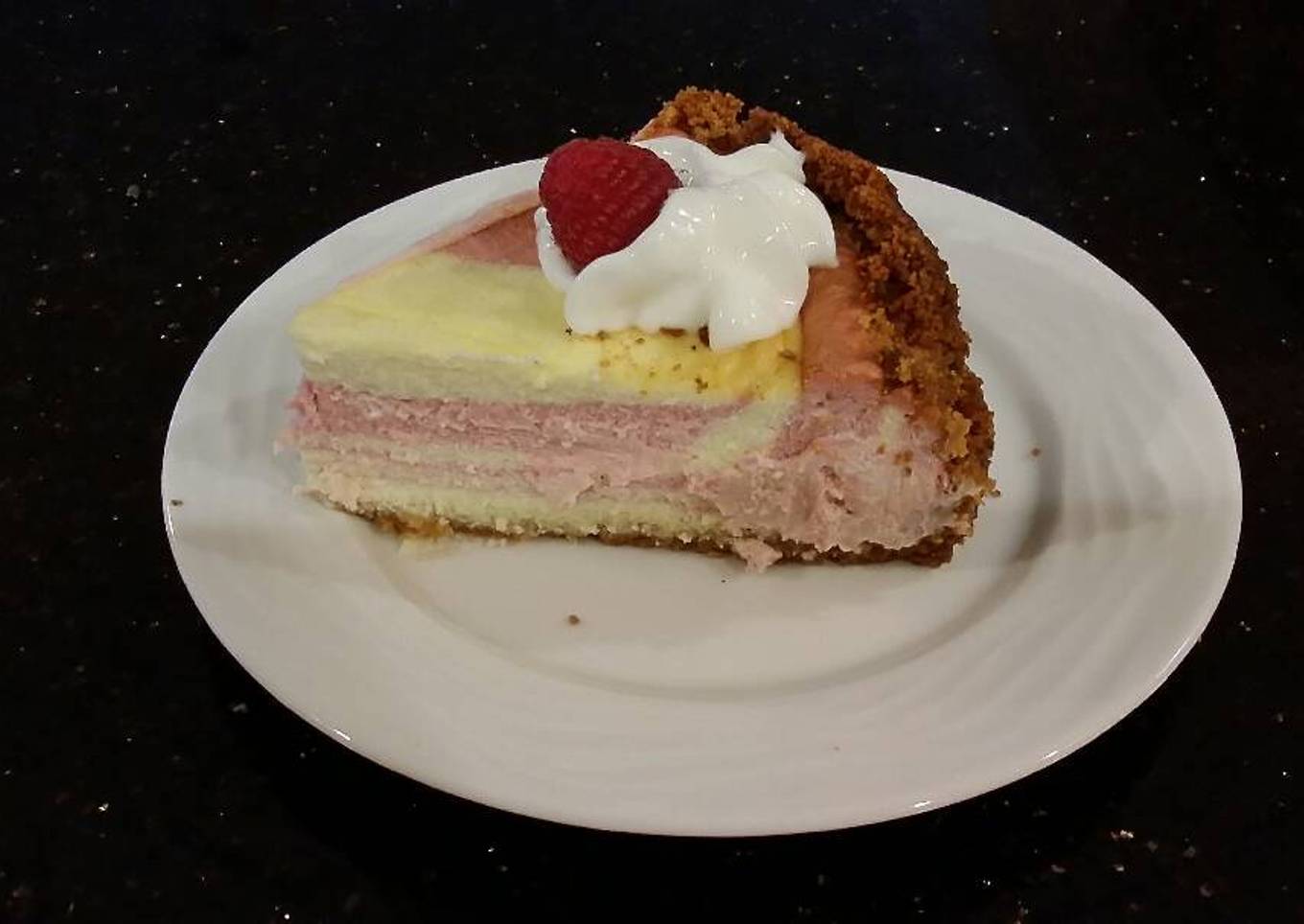 This cheesecake has fresh raspberry striped throughout it. It gives it a fresh bright flavor in a cheesecake with marscarpone as part of the cheese which makes for a more delicate very creamy chessecake