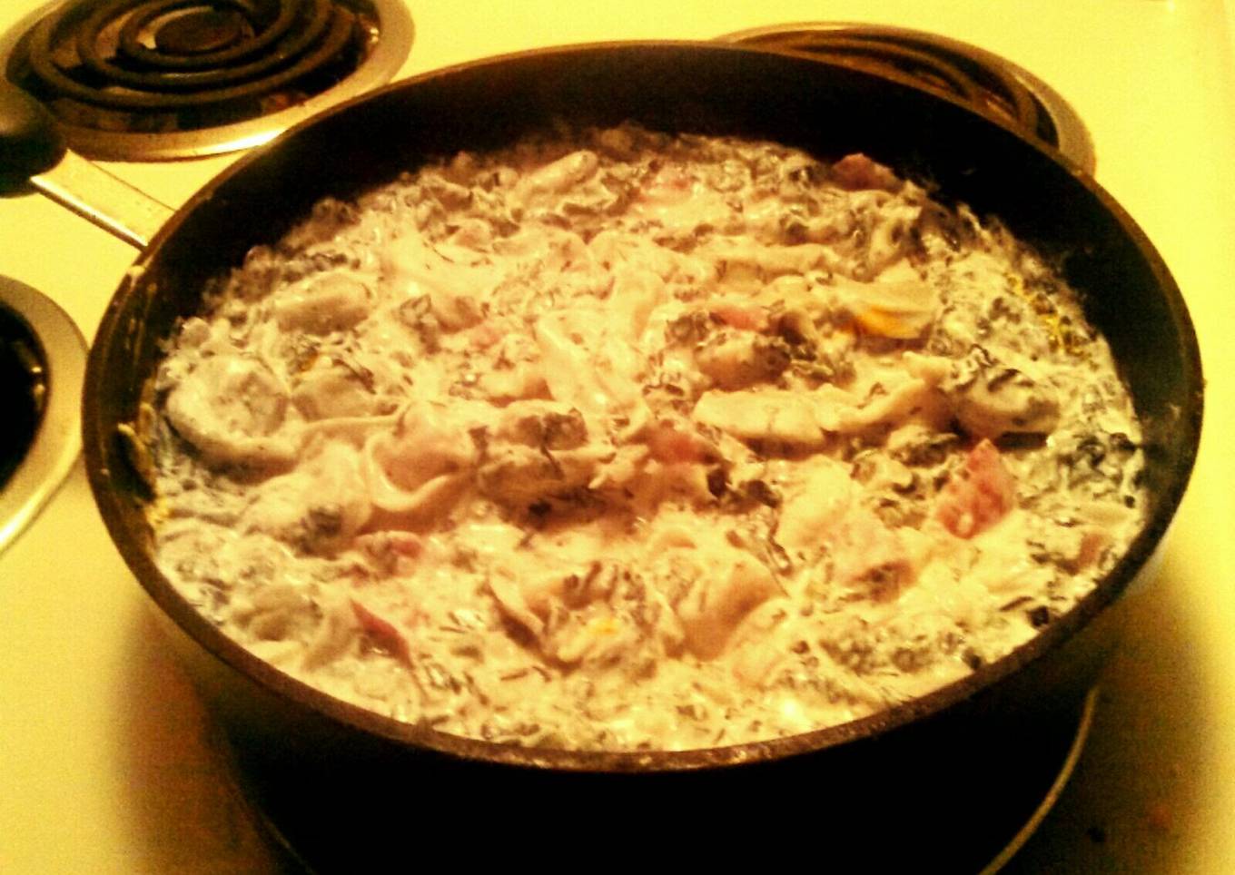 - Add your cooked tortellini into the sauce pan. Mix well, keeping at a boil for a few minutes. Reduce to a simmer and serve hot.