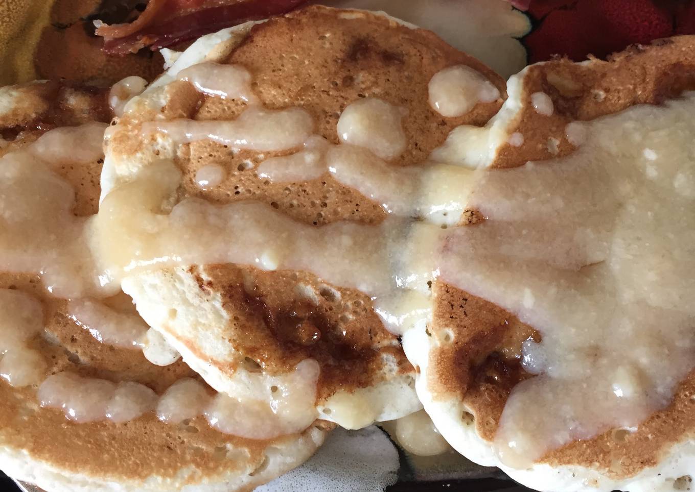 - Continue steps until you are done! Then cut a whole in the cream cheese glaze bag and drizzle over pancakes! Serve with a side of bacon! Or whatever you wish!