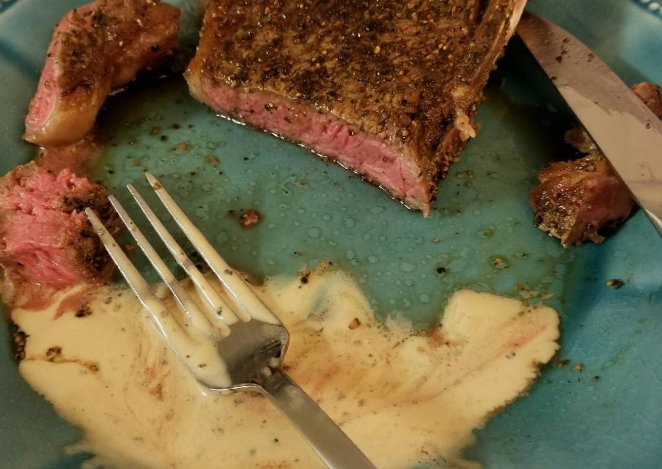 - Heat vegetable oil and 1 tablespoon of butter in a large skillet over medium-high heat until just smoking. Add the steak to the pan and sear on one side for 4-5 minutes for medium-rare.